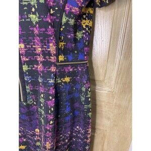 This Tahari Arthur S Levine tunic dress is in a beautiful purple color with a unique matrix print. It features a zip front closure, short sleeves, and a mid-length design. The dress is made of a blended fabric with a polyester lining, suitable for winter, fall, and spring occasions. With a designer and career-inspired theme, this dress is perfect for parties, casual outings, formal events, or business settings. Size 6, dry clean only.