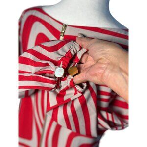 This striking Tahari Arthur S. Levine dress features a bold red and beige swirl pattern that captures the eye and exudes a sense of dynamic elegance. Its long sleeves and knee-length cut provide a graceful silhouette, while the unique buttoned cuffs and gold zipper add a touch of sophistication. Ideal for those seeking a vibrant yet polished look.
