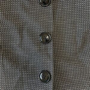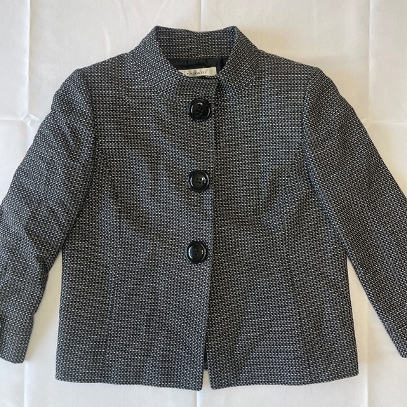 Elevate your wardrobe with this Tahari Arthur S. Levine textured blazer — a refined and polished piece that blends classic structure with modern style. This size 8 jacket features a unique high stand collar and three bold buttons that make a statement without overpowering your ensemble.