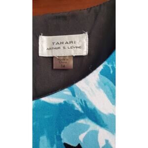 Tahari Arthur S Levine classic sheath dress size 14 . The dress features a beautiful floral pattern in shades of black and blue, making it perfect for any occasion, whether it be a wedding, party, or business event. The sleeveless design and round neckline provide a timeless look, while the zip closure at the back ensures a secure fit.