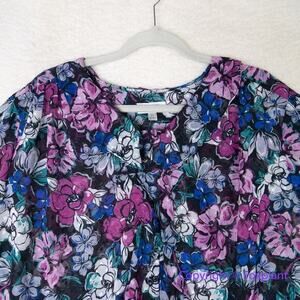 I adore this Tahari Arthur S. Levine floral print blouse with its charming swiss dot details! In size 3X, this sheer, flowy top is both elegant and romantic, perfect for adding a touch of femininity to any outfit. The delicate ruffle around the neck and chest brings an extra layer of style, while the long sleeves and button-up front make it versatile for any season. New with tags, this blouse combines a beautiful floral print with the playful texture of swiss dots, making it a lovely, standout piece for any wardrobe.