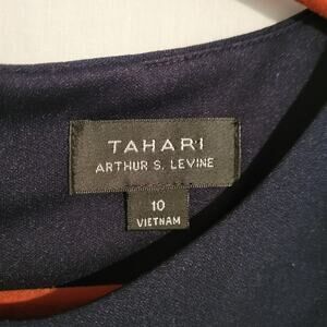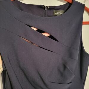 Tahari Arthur S. Levine sleeveless ruched side cutout detail sheath dress in a dark navy blue. It a has two slashed cutout details on the upper chest area. There are no pockets. It is lined. There is a 7-inch slit/vent on the back center. It has a zipper closure on the back. It stretches throughout.