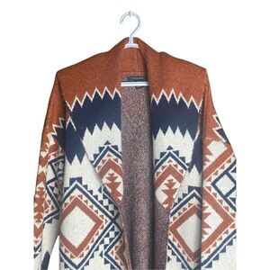 Tahari Aztec Cardigan Sweater Rust Navy Cream Geometric Open Front Women’s Mediu