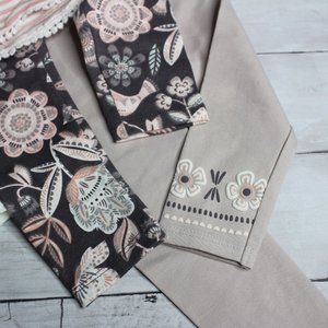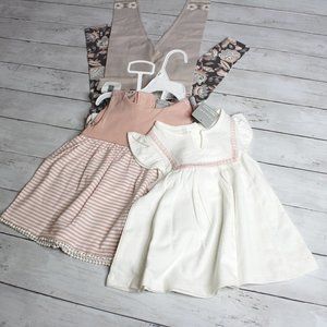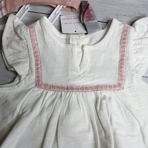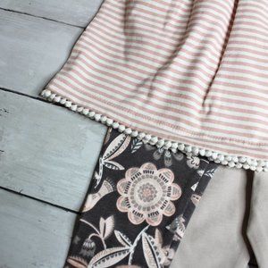 This four-piece mix and match set includes a sleeveless pink and white stripe tunic top with white pom pom trim, a white babydoll top with short flutter sleeves with embroidered ribbon trim, beige leggings with puffy flower trim and floral capri pants. The tops have back button fasteners and the pants pull on with elastic waistbands. The items are beautiful quality and oh so sweet. The set is brand new with tags however please know there is a very tiny pin dot stain on the front of the pink top. Please refer to photos.