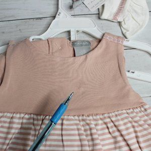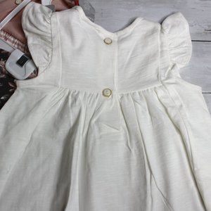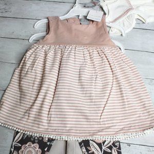 This four-piece mix and match set includes a sleeveless pink and white stripe tunic top with white pom pom trim, a white babydoll top with short flutter sleeves with embroidered ribbon trim, beige leggings with puffy flower trim and floral capri pants. The tops have back button fasteners and the pants pull on with elastic waistbands. The items are beautiful quality and oh so sweet. The set is brand new with tags.