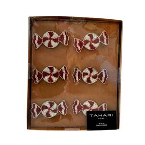 Tahari Beaded Peppermint Candy Napkin Rings Set of 6 Red White Christmas