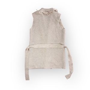 Stylish knit vest by Tahari. Features a belted waist and fringe details. Perfect for layering.