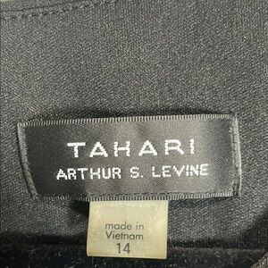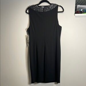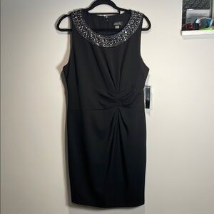 This stunning black mini dress by Tahari Arthur S. levine is perfect for a cocktail night out, featuring a sleeveless sheath design with a crew neck adorned with elegant embellishments. The ruched detailing at the waist enhances its flattering silhouette, making it a sophisticated choice for any evening event.