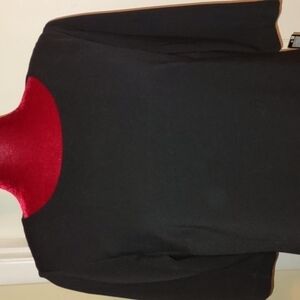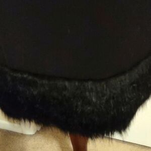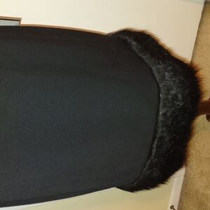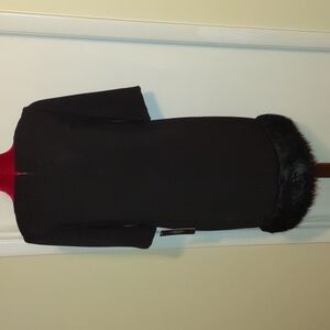 Beautiful Tahari Black Cocktail Dress with faux fur trim at the hem. The knit fabric makes this dress super comfy, and the cut is super forgiving. Elbow length sleeves; contrasting back zipper and lining are a gorgeous shade of deep mauve. NWT