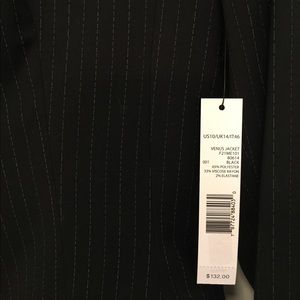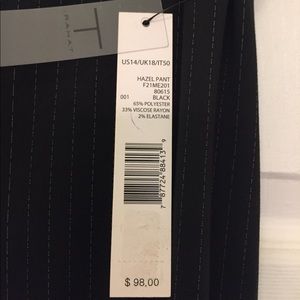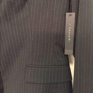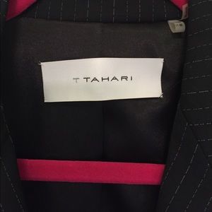 NWT never worn T- Tahari Women's Black with White Pinstripe suit. I bought these a separates since I needed a larger size on the bottom. The Jacket is a size 10 & is a one button closer with light shoulder pads. The pants have also never been worn and still have the tags are size 14 (they run very small-closer to a women's 10) with more of a flare or bootleg bottom.