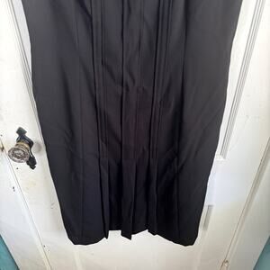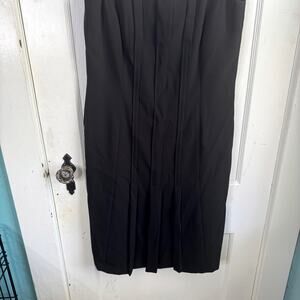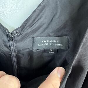Tahari Black Pleated Sheath Dress Scoop Neck Sleeveless Professional Classic Size 10. Little Black Dress. Lined. Lining has side vents so as not to limit movement. Pleats down front of dress. Rounded V-neckline in back with hidden zipper. Very good, preowned condition. Please see measurements to determine if this dress would hit at a midi length or below the knee on your height.