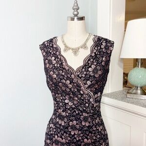 Tahari ASL Black & Rose Gold Lace Sheath Dress. Wrap style V neck top. Scalloped trim at the neckline and hem. Pink sparkles woven throughout. Stretchy, and lined with a full zipper in back. Length is below the knee. This is like new and size 2. The dress shows the best color in the last photo.