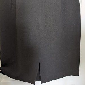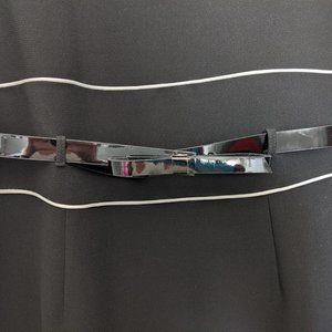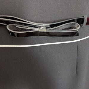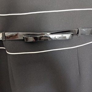 Black polyester dress with white piping at waist. Black patent bow cinch waist belt. Kick pleat in back. 100% polyester. Never wrinkles, great travel dress. Size 8. Measurements: Shoulder to hem length 37 inches, Bust 36 inches, Waist 32 inches, Hips 38 inches. Excellent condition. Travels well