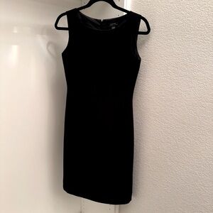 This elegant black mini sheath dress by Tahari features a classic crew neck and a sleeveless design, perfect for a stylish night out. Its fitted silhouette beautifully accentuates the body's shape, making it a timeless choice for any cocktail occasion.