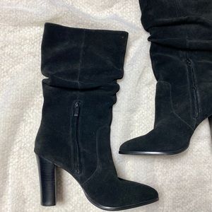 Step out in style with these Tahari black heeled boots, crafted from luxurious suede for a soft touch. Featuring a sleek, minimalist design, these ankle-height boots boast a 3-4 inch heel, perfect for elevating any outfit with sophistication. Ideal for fashion-forward individuals seeking a versatile and chic footwear option.