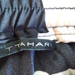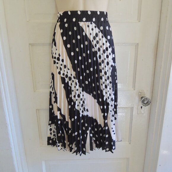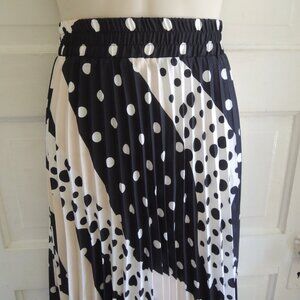 T Tahari black & white pleated polka dot skirt, size Small. Featuring dramatic swirls of black, white & cream with polka dot print, this elegant skirt has a wide, comfy elastic waist, knife pleats, midi length, and A-line design. Lightweight and flowy, pull-on style, with a playful yet sophisticated vibe. EUC.