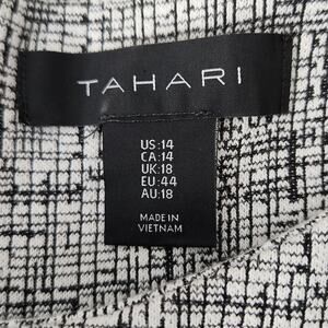This lightweight Tahari sheath dress blends timeless polish with modern versatility, featuring a black and white tweed-inspired print and a sleeveless, waist-skimming silhouette. The tailored fit and functional pockets offer both structure and ease, making it ideal for professional settings, semi-formal events, or elevated everyday wear. Size 14