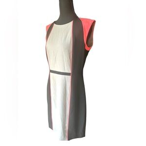 Elegant sleeveless dress by Tahari. Features bright coral and black panels with a white center. Ideal for chic outings or work!