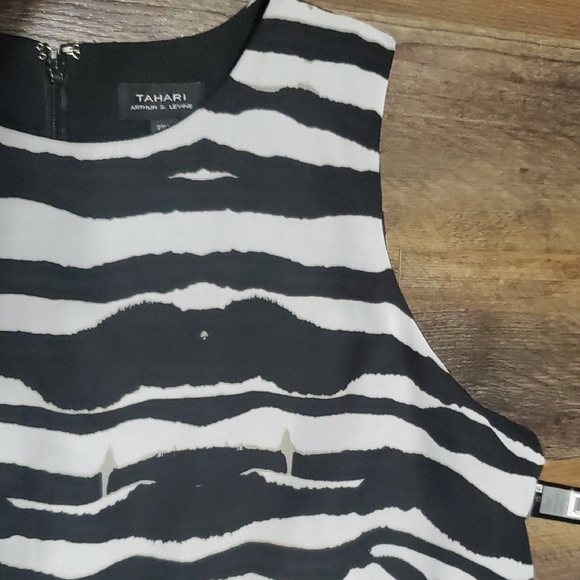 This Tahari jumpsuit showcases a striking black and white zebra print sheer overlay that adds a bold touch to the classic wide-leg silhouette. The sleeveless design is complemented by a dramatic cape-like overlay, creating a chic and sophisticated ensemble perfect for any stylish occasion.