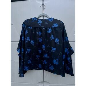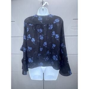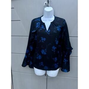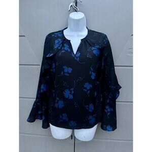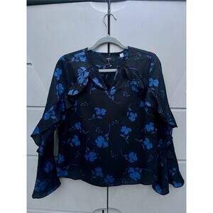 Tahari Black/Blue Fulton Stems Ruffle V-neck Bell Sleeves Blouse Top Size S NEW