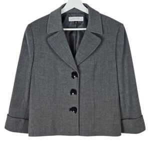 Tarhari Arthur S. Levine slightly cropped (hits at waist) 3-button long sleeve blazer jacket with fabric bows on buttons and pintucked cuff details