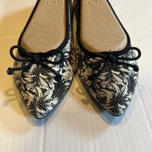 Tahari Blossom flat pointy shoe with bow in black and floral off white flowers