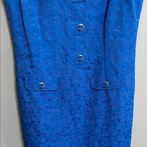 Elegant fall blue midi dress with textured pattern. Features button details and sleeveless design. Easily layered with a cute sweater.