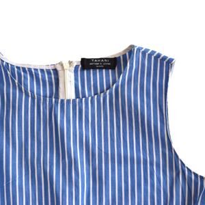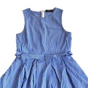 Chic Tahari Arthur S. Levine petite dress in blue and white pinstripes. Sleeveless design with a flattering fitted bodice, defined waist, and flowy handkerchief hem skirt. Back zip closure. Lightweight and elegant—perfect for summer events, brunch, or workwear styling.