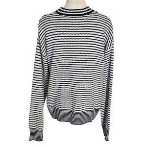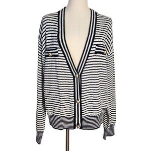 Tahari Blue White Striped V-Neck Cardigan with Brush Gold Buttons Women's Size L