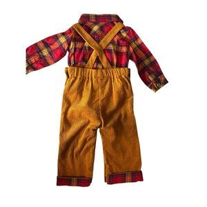 Tahari Boy's Brown Red Plaid Corduroy Overalls Set With Flannel Shirt 6-9 Months