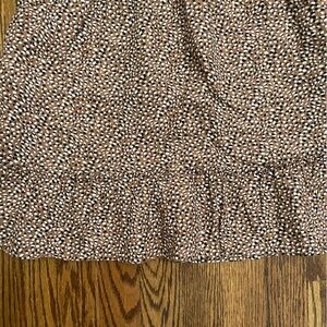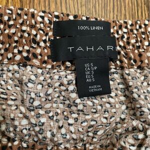 This is a ladies Tahari brown and black spotted skirt. It is 100% linen, has side pockets and a ruffle at the bottom. It is a size small and is in perfect condition.