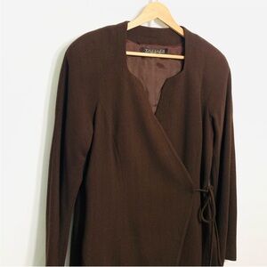 Tahari Brown Suit 2 Piece Wool Pantsuit Long Line Jacket Fully Lined Pants Sz. 8