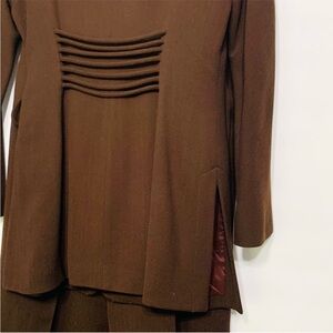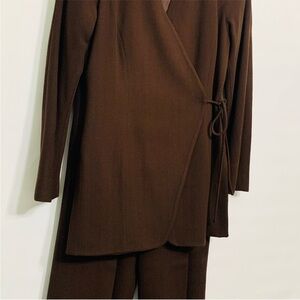 Tahari Brown Suit 2 Piece Wool Pantsuit Long Line Jacket Fully Lined Pantsuit