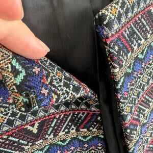 Excellent preowned condition. Colorful funky patterned woven crew neck lined blazer. Has hook & eye at top. Polyester/cotton material. Approx. measurements: Shoulder to hem 24", pit to pit 23", sleeve from neck to sleeve hem 27". Size 16P.