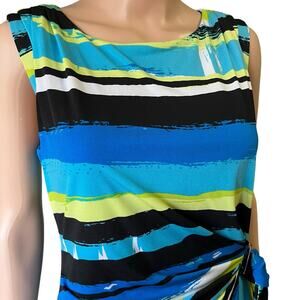 Tahari By Arthur S. Levine dress is 95% polyester, 5% Spandex. Dry clean. Multicolor stripe, pleated shoulders, faux wrap tie with gold hardware. Style 5223P076. Career wear, business, professional, date night, designer, church, concert, theater, preppy, mature.