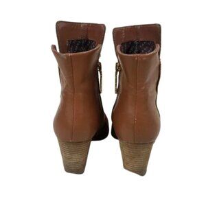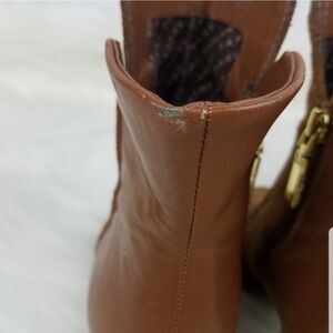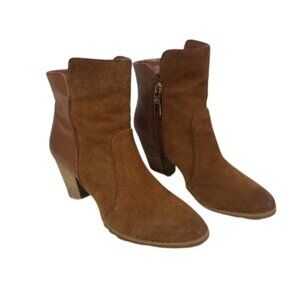 Tan or cognac color. Faux suede and leather. 3-inch block heel. Very comfy. Minor wear/scuffs as shown in pics. Great condition.