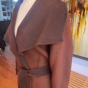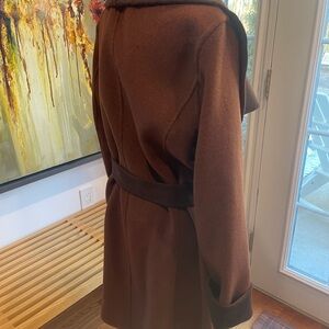 Elegant Tahari trench coat in deep chocolate. Features a stylish belt and wide collar. Perfect for a chic look.