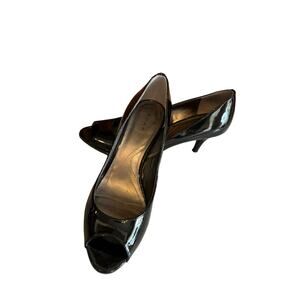 Tahari Marie patent leather open toe heels in black size 8.5. Very good preowned condition. Modest 2 3/4” heel. Perfect for work!