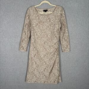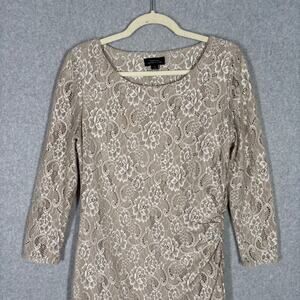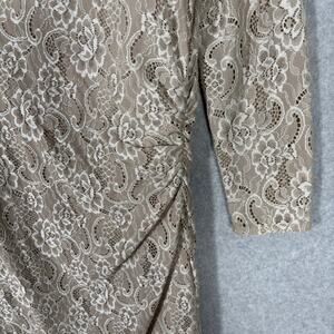 Tahari Dress 10 Tan Cream Knee Lace Ruched Sheer Stretch Mother Neutral Evening