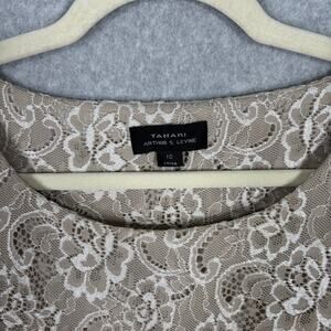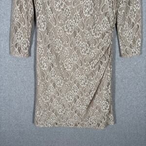Tahari Dress 10 Tan Knee Lace Ruched Sheer Stretch Mother Bride Groom Evening Asymmetric Floral Flowers Party Wedding Cocktail Formal Evening Bridesmaid Holiday Christmas Event