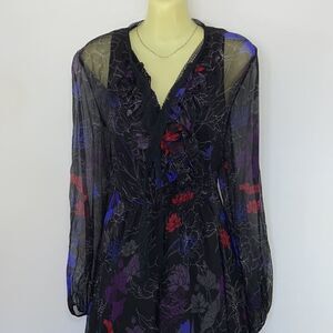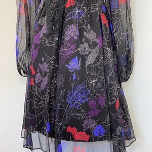 BY ELIE TAHARI, HERE IS THE FABULOUS “DESI” DRESS. IT IS 100% SILK CHIFFON AND LINED IN A POLY/ SILK BLEND. THIS BEAUTIFUL TAHARI FEATURES A OPAL BLUE SHELL WITH FLORALS IN RED, LILAC AND WHITE THROUGH IT. IT HAS A TIE NECK, ELASTIC WAIST AND BISHOP SLEEVES. THE V NECK IS ACCENTED WITH A DEEP RUFFLE. SOFT, LOVELY AND COMFORTABLE. EXCELLENT CONDITION~NWOT~ SIZE EIGHT BUT PLEASE NOTE THE MEASUREMENTS