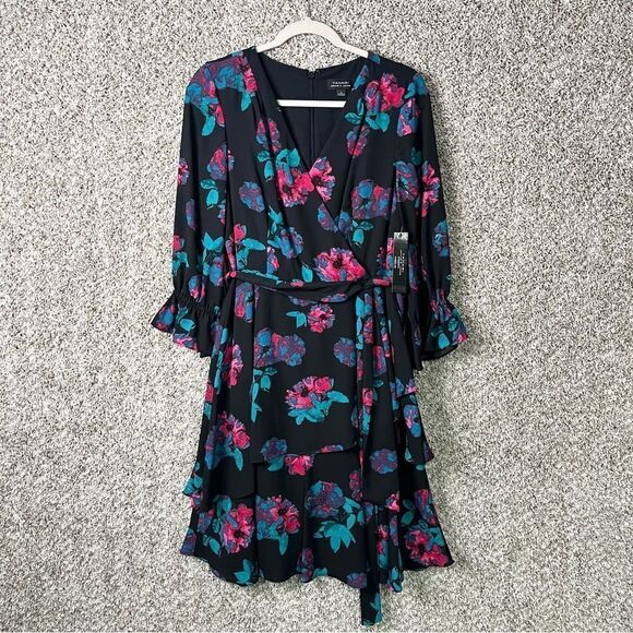 New with Tags Women’s Tahari Black, Magenta Pink and Teal Blue Floral Print Faux Wrap Tie Waist V-Neck Dress in Size 6