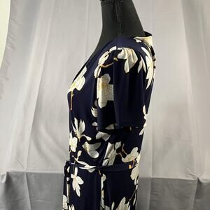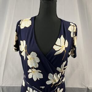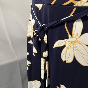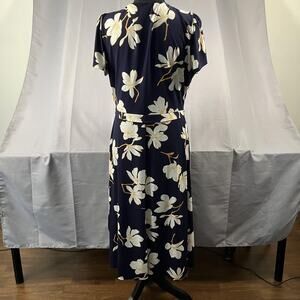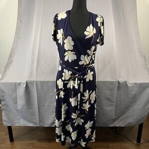 Tahari Dress Womens Large Navy Blue Floral Wrap Midi Short Sleeve Belted V Neck