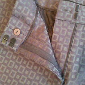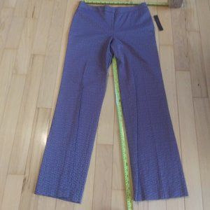 NWT Elie Tahari "Lolita Pant" " Pewter" size 10. Tag reads Pewter for color ... it is this gray/silver color patterns pants with a very light green in the background of the geometric pattern 60% Tencel ( had to google that one) 38% Viscose 2% spandex . DRY CLEAN ONLY . . Flat Lay Measurements: waist ~ 15" . Inseam ~ 30". Please above photos for what was measured. Thank you . Back pockets are sewn shut.. Dress pants/slacks