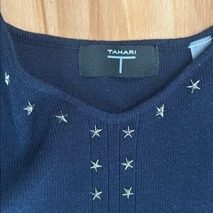This stylish tank top by Tahari features a fitted design with eye-catching silver embellishments running vertically down the front. The sleeveless cut and stretchy fabric offer a comfortable fit, making it a versatile addition to any wardrobe.