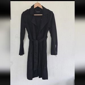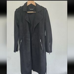 Tahari Faux Leather Long Jacket Coat Small Women Black Zipper Pockets Belted New