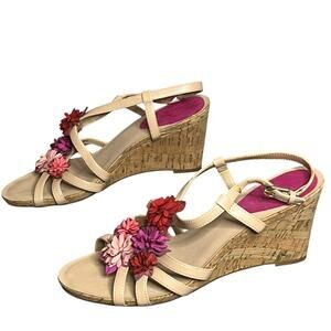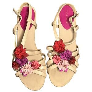 Tahari Favor Wedge Sandal Womens Size 9M Beige Leather Spring Flowers Strappy