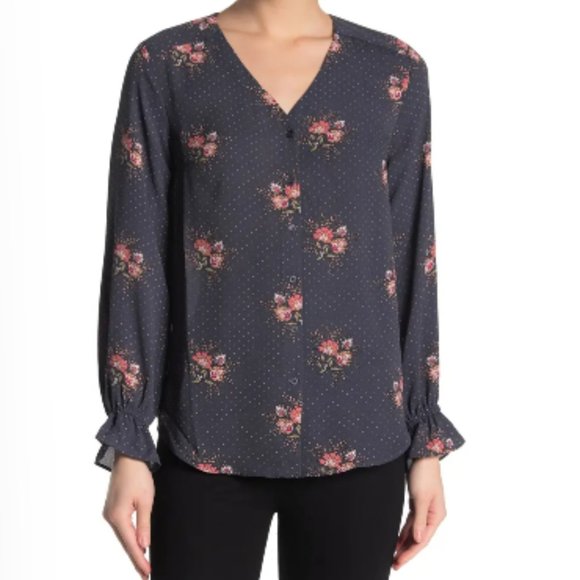 A feminine blouse features a long sleeve with ruffle cuffs and a button front closure.