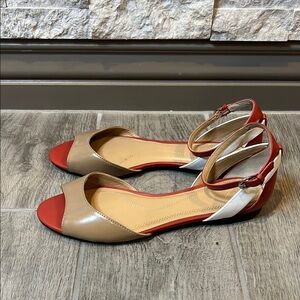 These New without tags Tahari sandals feature a chic peep-toe design highlighted by a striking red accent against a cream backdrop. The adjustable ankle strap offers a secure fit, while the natural insole ensures comfort throughout the day.
