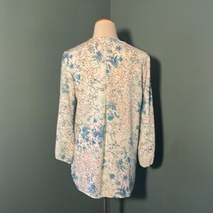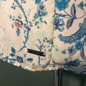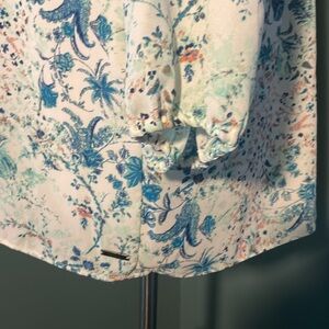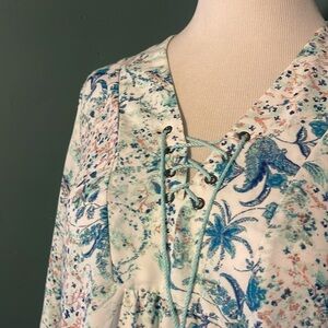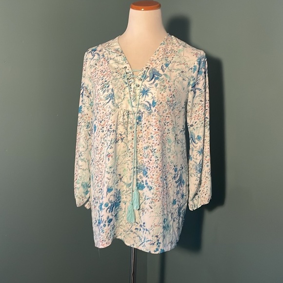 Elegant Tahari blouse with a floral pattern. Features a lace-up front design. Perfect for a stylish look.